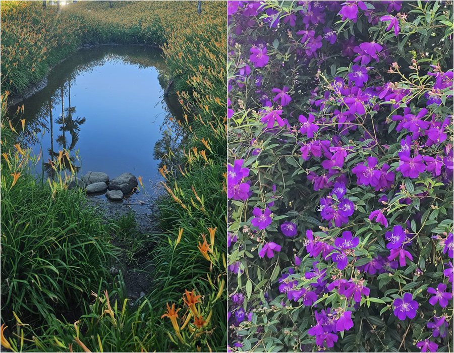 小台灣藏諸於靈秀山林花叢間,站在小路旁觀賞,周邊的檳榔樹和金針花在水中倒影,形成天空之鏡,盡收眼底,酷似一座萝幻美麗之島。