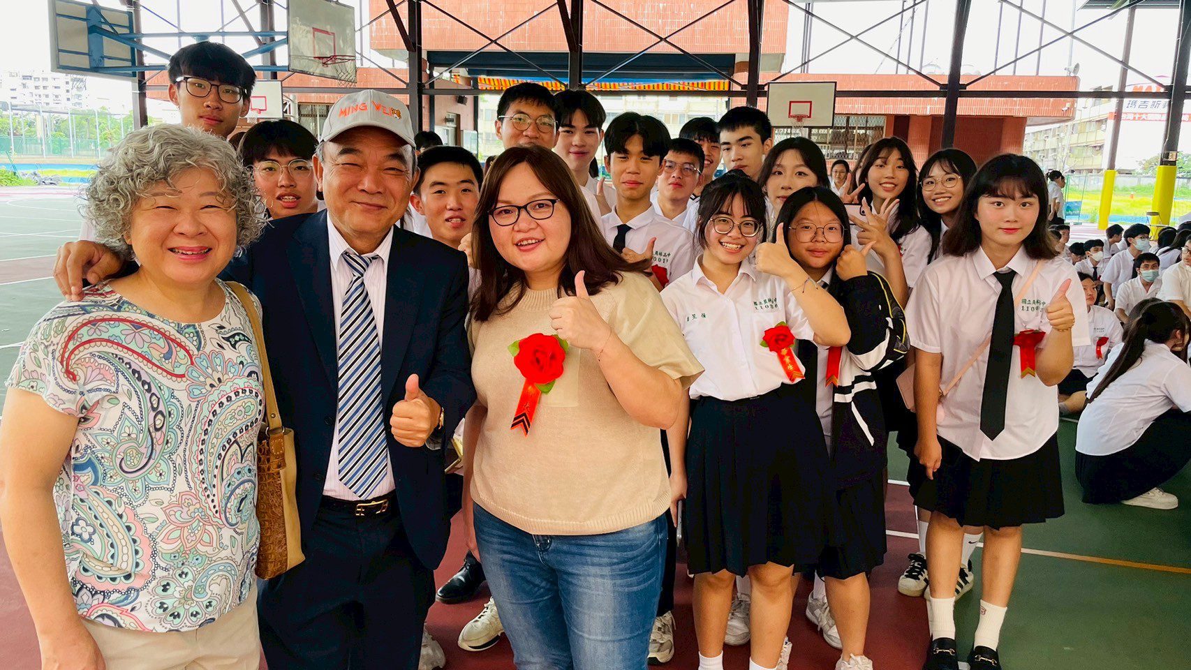 今日正式典禮,會場以大型星球氣球與星光投影打造出「員宇宙星際」,氣氛夢幻迷人。畢業生們穿越星光大道,象徵邁向新的人生旅程。典禮中,畢業生特別以自編、自導、自演的方式,深情呈現畢業歌《驀然回首》。這首歌由周薀儀與陳宓彤兩位同學作詞,劉輝安同學作曲,黃堉彰同學擔任鼓手,並由連續兩屆校內歌唱比賽冠軍的陳宓彤、陳鈺芬與陳宥芹三位同學共同演唱。歌聲動人、情感真摯,令全場動容,成為第74屆畢業生共同珍藏的深刻回憶。