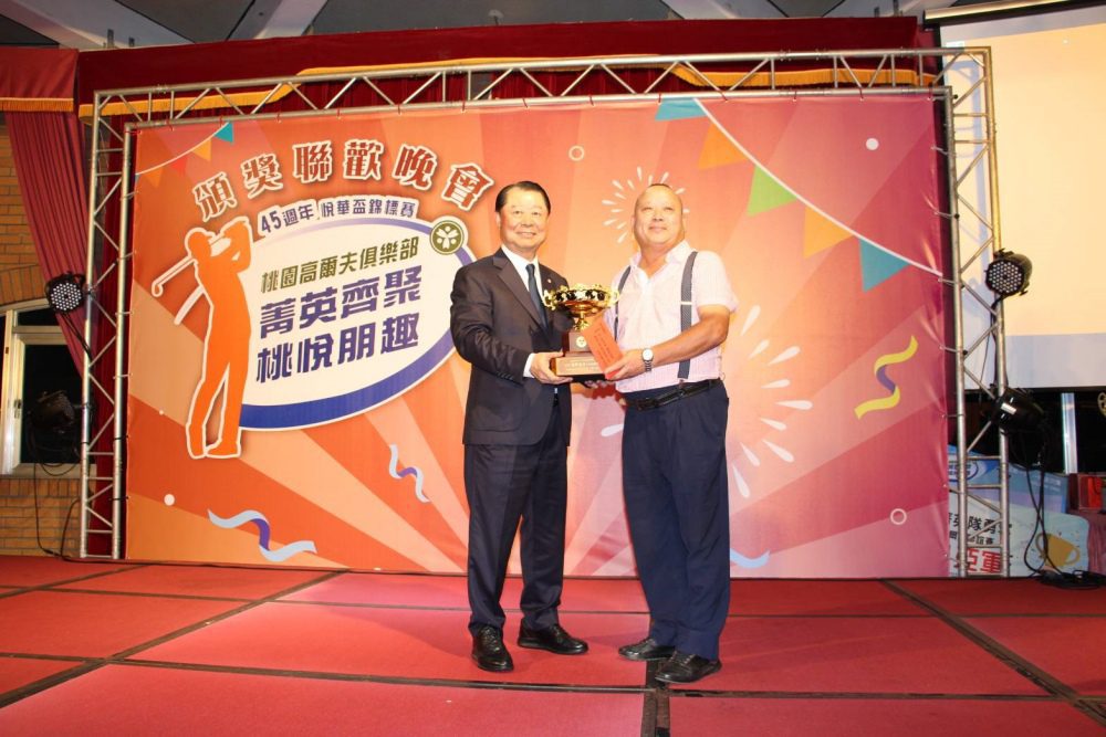 ▲由天成飯店集團董事長張茂松(左)頒發「菁英齊聚 桃悅朋趣」悅華盃錦標賽男子組總桿冠軍-黃光男。(圖/桃園高爾夫俱樂部提供)