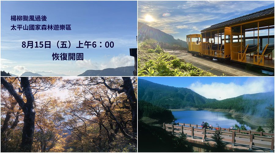 楊柳颱風已經遠離,太平山國家森林遊樂區經現場勘查並完成環境設施整備後,訂於8月15日早上6時起恢復開園。