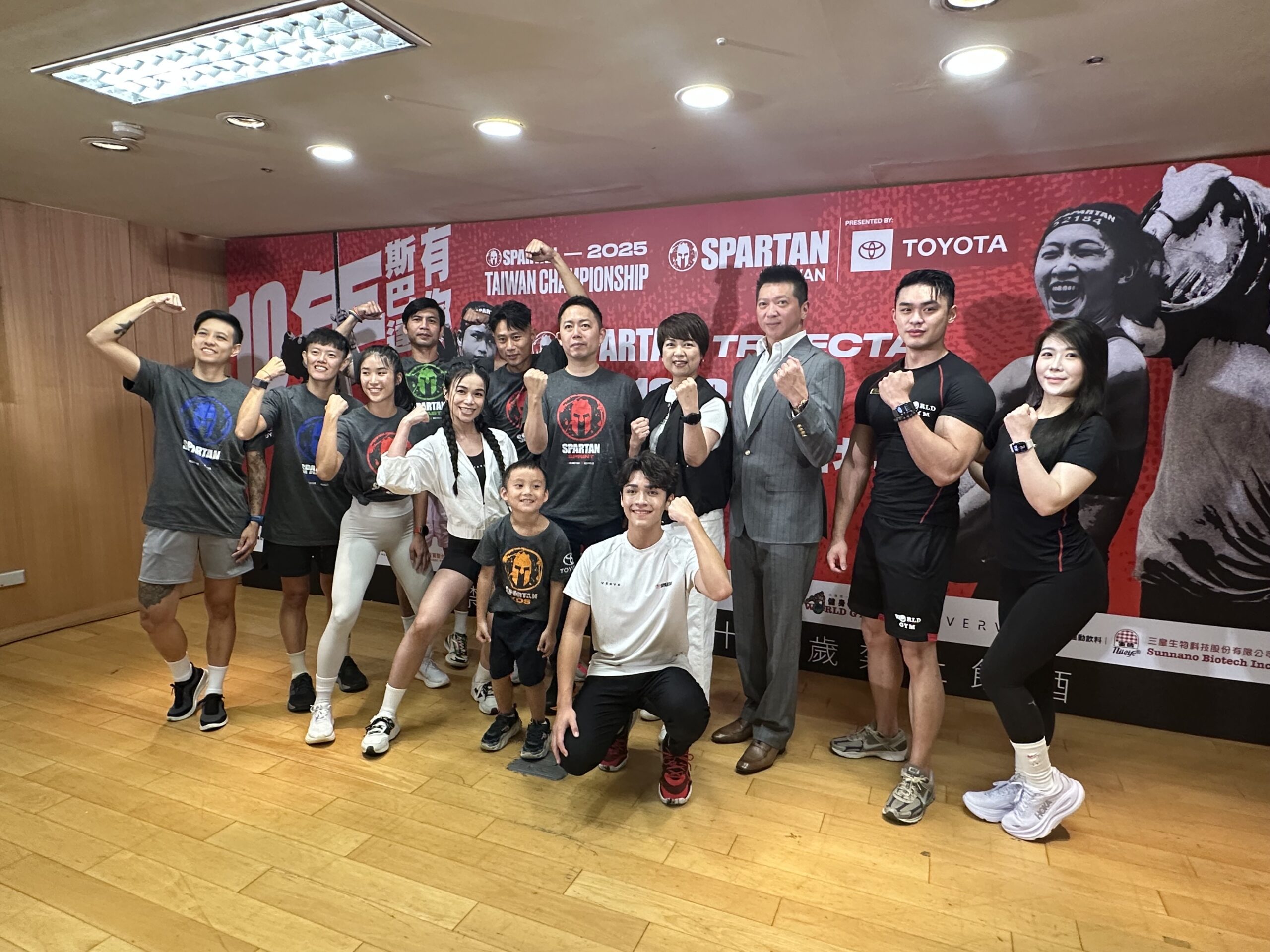 斯巴達品牌大使們和World Gym的健身教練們,在記者會現場比划起來。(圖/記者李婷婷攝)