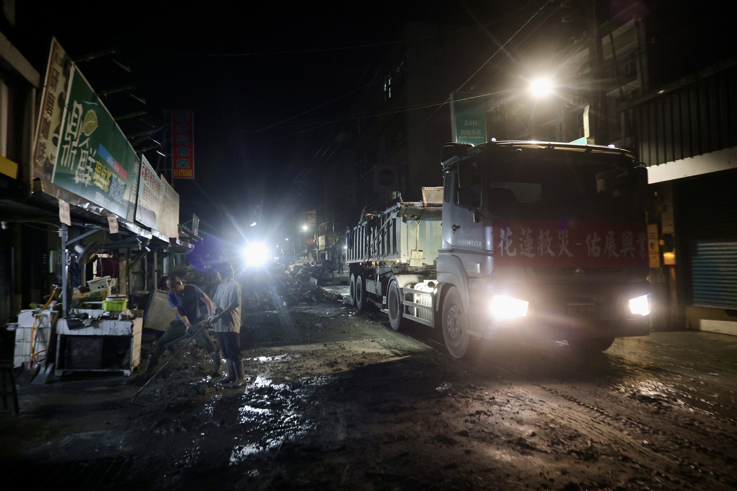 花蓮光復鄉馬太鞍溪堰塞湖溢流潰壩,造成街道、民宅滿是淤泥,花蓮縣環保局聯合外縣市團隊及國軍設法避開白天人潮最多時刻,昨(28)日深夜加強清運大型垃圾及淤泥土堆,以期加速恢復市容。