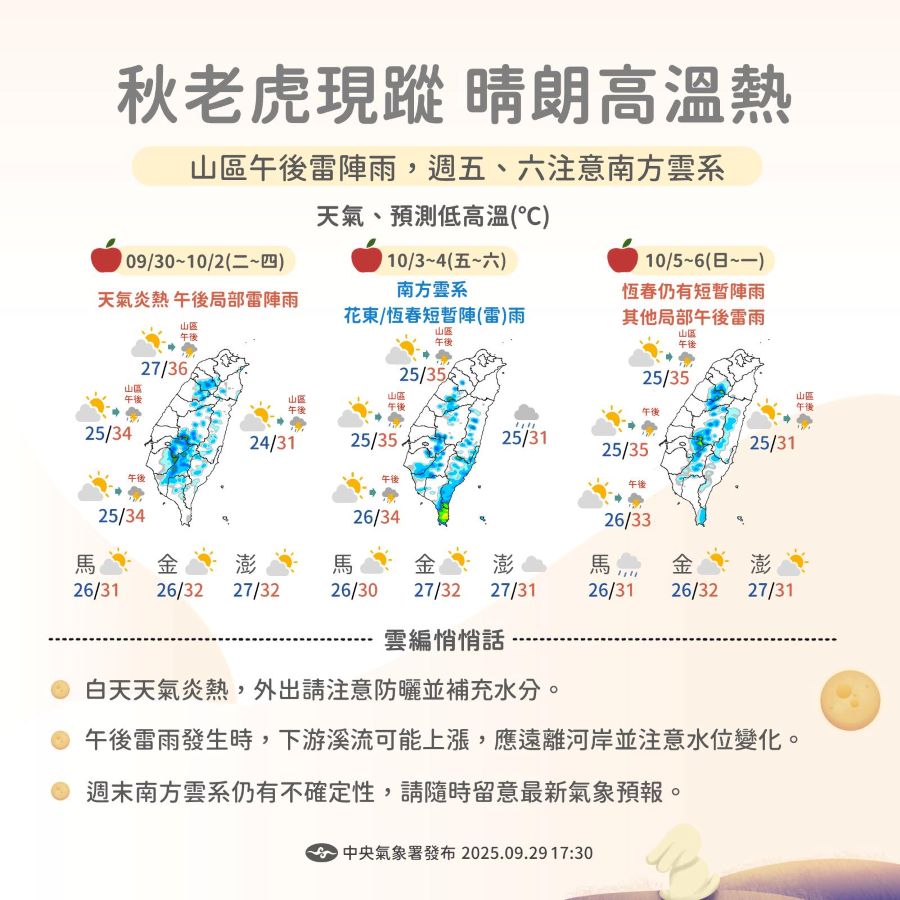 氣象署進一步說明,9/30(二)~10/2(四)各地大多為晴朗好天氣,天氣穩定偏熱,白天高溫普遍上看 34~36°C,局部地區甚至更高。午後熱對流發展旺盛,南部及其他山區易有短暫雷陣雨,外出請記得攜帶雨具,以防萬一。