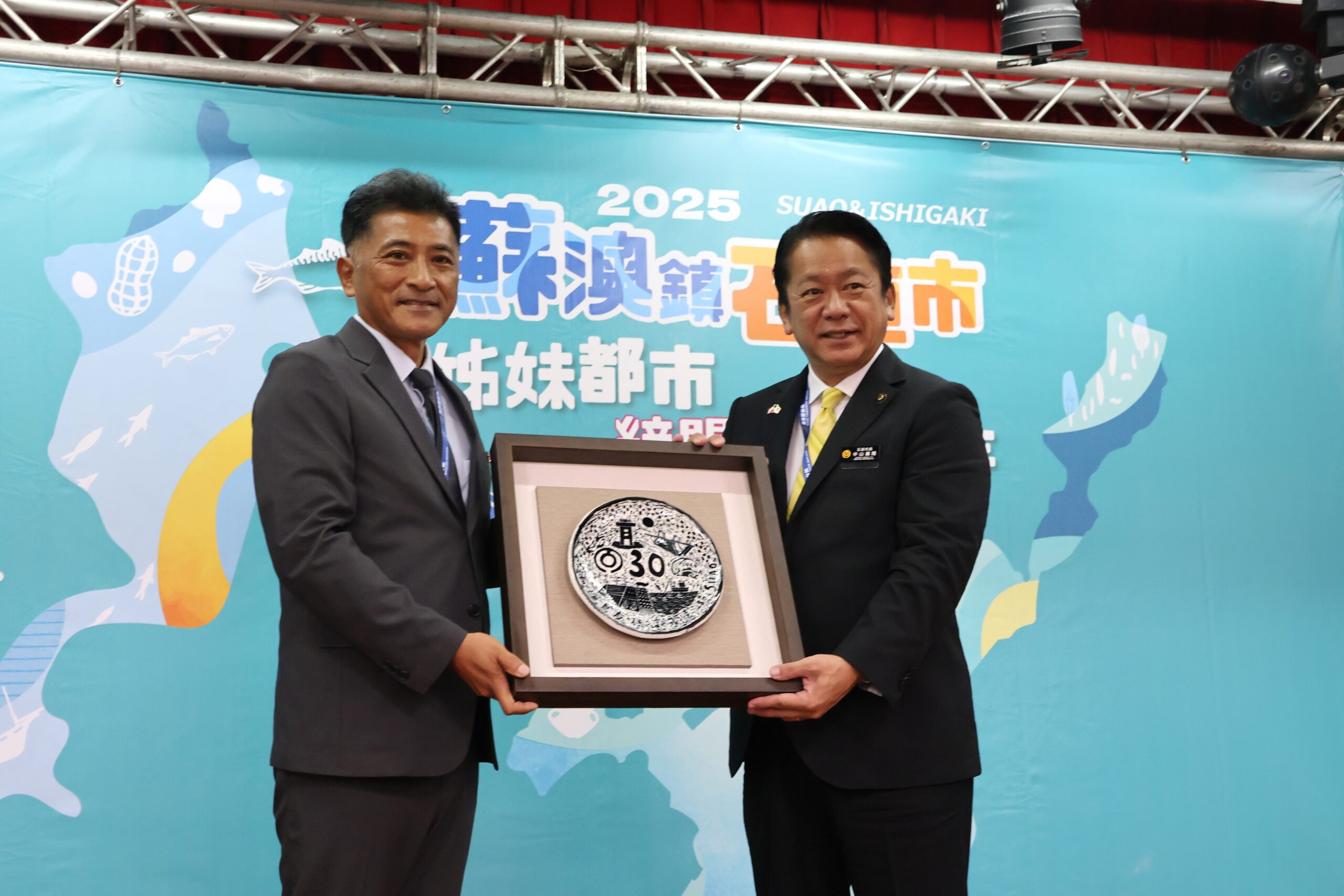 「蘇澳鎮&石垣市締盟30周年」紀念活動,2日在蘇澳鎮公所舉行,石垣市長中山義隆率35人訪問團再度造訪蘇澳,前行政院長(時任宜蘭縣長)游錫堃、前鎮長林棋山、李坤山等人偕蘇澳各級民意代表、觀光工廠群、商界、社團均到場觀禮見證。