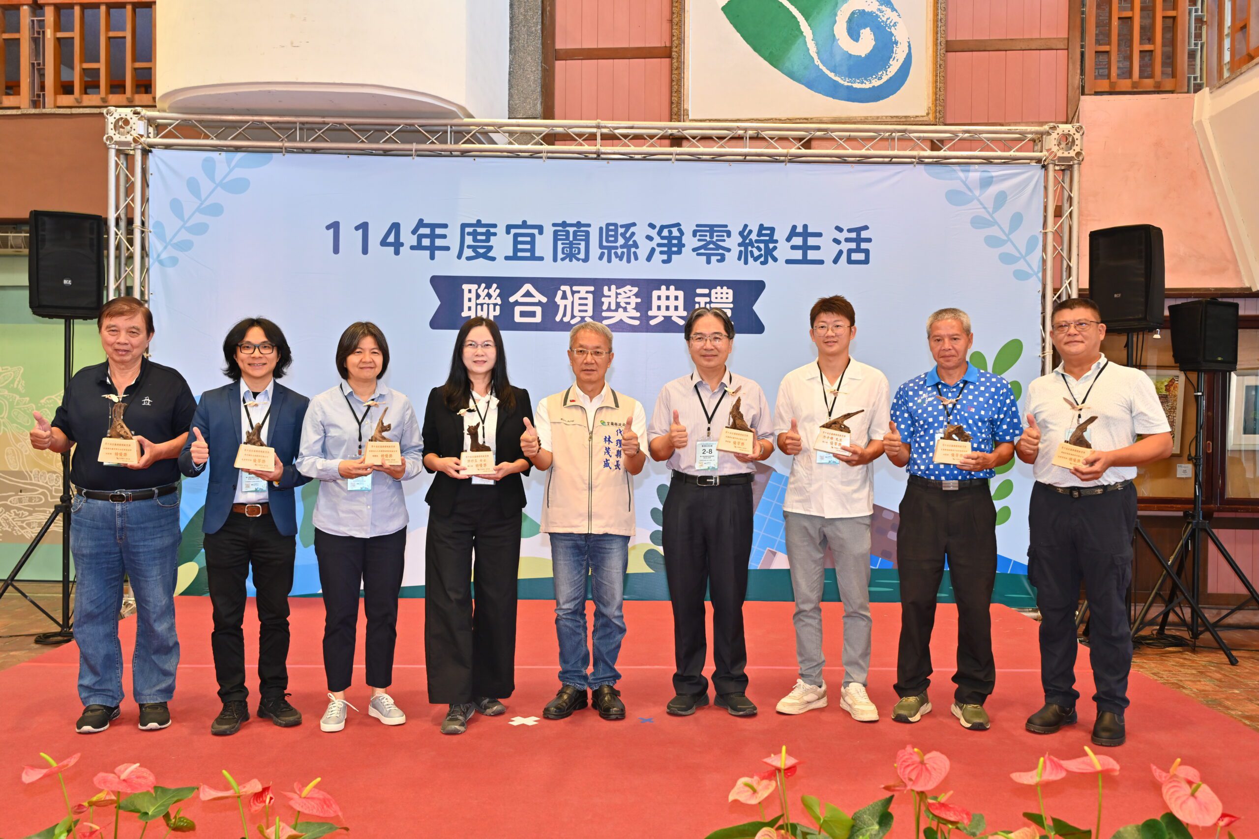 「114年宜蘭縣淨零綠生活聯合頒獎典禮」3日在縣府縣民大廳舉辦,頒發獎項包括環境教育繪本創作比賽、第十屆宜蘭縣環境教育獎、第七屆國家企業環保獎、綠色採購申報1,000萬以上績優單位、綠色採購申報100萬以上績優單位、空氣品質淨化區優良認養單位以及環保低碳寺廟認證單位等7個獎項。